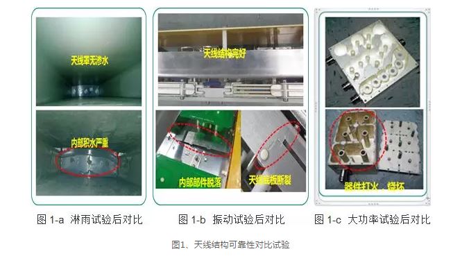 天線產(chǎn)品的可靠性的檢驗可以通過一系列試驗來判斷,可靠性試驗是對天線產(chǎn)品進行可靠性調(diào)查、分析和評價的重要手段。天線的可靠性試驗包括高低溫試驗、淋雨試驗、振動試驗、沖擊試驗、碰撞試驗、汽車運輸試驗、風(fēng)載試驗、攝冰試驗和功率試驗等。通過環(huán)境試驗可以檢驗天線產(chǎn)品結(jié)構(gòu)的可靠性。如圖1所示,為淋雨試驗、振動試驗和大功率試驗后,滿足可靠性要求的天線與不滿足的對比測試結(jié)果。